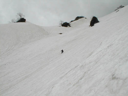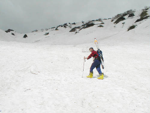 山スキーメーリングリストでもおなじみ、バンディット布教協会会長?小野さんと長走沢に行って来ました。前日は山スキーの話で盛り上がりいろいろなお話をお聞きしました(実はソロで屏風岩登っちゃうクライマーだった)。私が行ったことのない長走沢をガイドしていただき楽しいスキーができました。大雪渓にも負けない素晴らしい大斜面が待っています。みなさんも行ってみて下さい。お薦めお手軽ルートです。もしかして小野さんのアップってインターネット初公開?