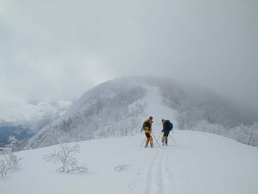 スキーをはいてもヒザ下まで沈む重いラッセルを2時間繰り返した3人は中