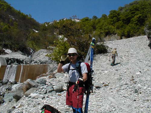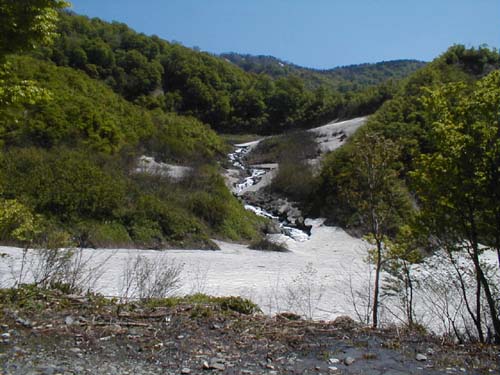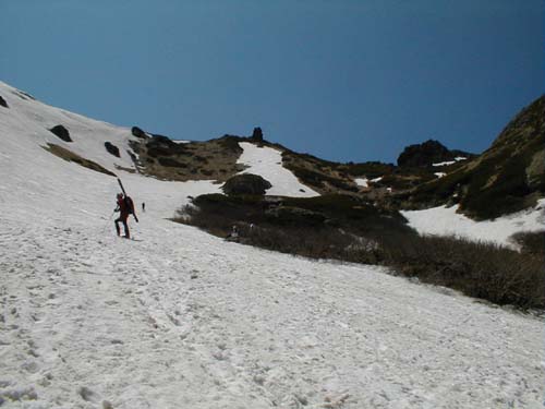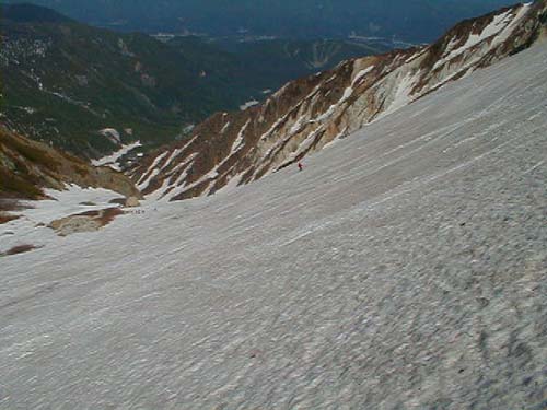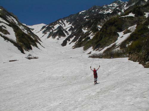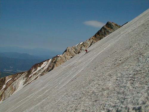 やっぱり白馬大雪渓(稜線直下まで) 01.06.03 オオサワくん 横山(文、写真) 今年の冬にスキーで肩の骨を骨折してしまったオオサワくんであったであったがなんのその。ゴールデンウィークは我慢したもののみごとシーズン中に復活を成し遂げた。今回は病み上がりの快気祝い記念?で大雪渓を滑ることにした。天気最高!!!
