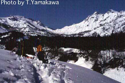 しかし、良かったのは最初の30メートル程の間だけだった。ちょっと湿った新雪でまあまあ楽しめたのだが、後は表面かりかり中はふっくらのもなか状態で1000メートルのアルバイトで疲れた足にはかなり応えた。しかし、目前の阿弥陀、烏帽子を見ながらの滑走は最高の気分であった。