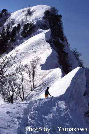 稜線に出るとじゃじゃーーーんという感じで鉢山が目に飛び込んできた。5時間以上のアルバイト、標高差は優に1000メートル稼いでいるのだが、周りは樺林でいつもとは雰囲気が違う。北アルプスとは違い、稜線でも標高1500メートルなのでこんな景色なのだ。日本海のたっぷり湿った雪のおかげか頂上直下はどでかい雪庇が発達している。しかも、新雪が岩壁を化粧し厳冬期の装いであった。ここで我々はクライマーに変身し、頂上を目指す予定であった・・・が、やせたナイフリッジで左は45度の一枚バーンしかも50センチの新雪付き。右はいつ崩れるかわからない1メートル以上張り出した雪庇。「雪崩れてもやだし、雪庇がくずれるのもやだし、やーめた。」というわけでこうゆう時の判断は実に早く途中で引き返すこととした。えせクライマーからスキーヤーにまたまた変身した我々は本日のメインイベントということで、新雪の中吉尾平めがけて滑り出した。