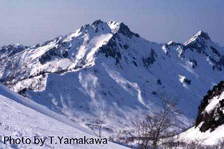 ちょっと見晴らしの良い所でで一休みし、杉のうるさい林を抜けると気分の良いまばらな広葉樹林となり、しばらく登り昼闇谷を横切る。昼闇谷はとても開けていて気分の良い斜面がある。尾根を図対に稜線を行くのだが、結構地形は複雑なので視界が悪いときは難しいと思われる。事実、先々週我々はこのあたりで悪天候のため引き返している。右手前方に小鉢山、さらに右側には阿弥陀岳と烏帽子岳がすばらしい。日本離れした景色である。烏帽子東綾からのアタックは手強そうに見えた。小鉢山直前で昼闇の稜線から降りてくるテレマーカーを見つけた。べたべたの湿雪にかなり手こずっている様子であった。