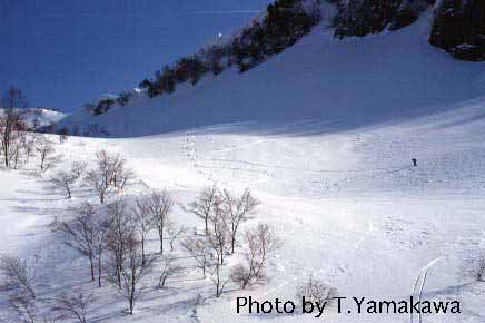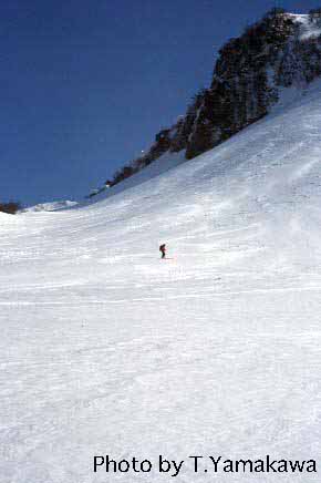 山スキーをやっていると滑ろうとしているルートよりも更に魅力的なルートを運悪く?見つけてしまうことが良くある。今回もご多分に漏れず見つけてしまった。稜線から少し下り岩場のすぐ横の急なルンゼをエクストリームっぽく抜けると少し広いまばらな樺林といういかにも雪崩がでそうな、いやよだれのでそうなおいしい斜面を見つけてしまった。(後日山川さんが単独で滑った。)
