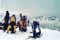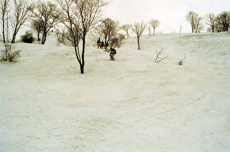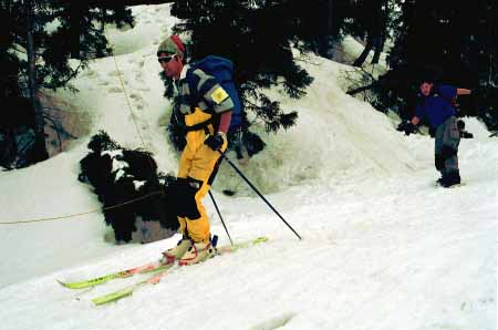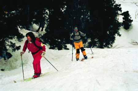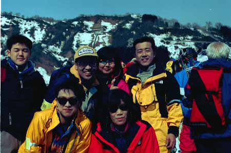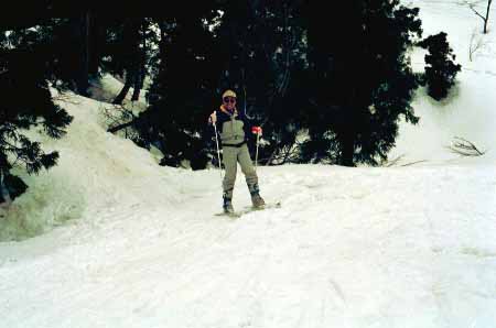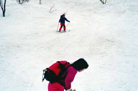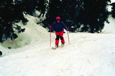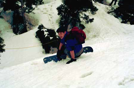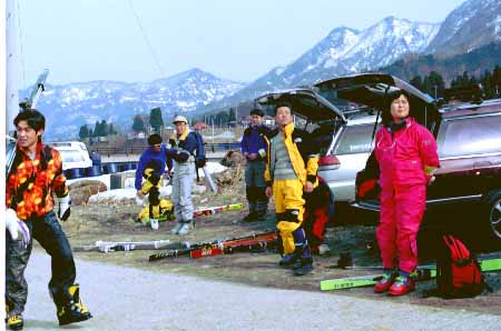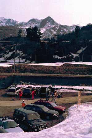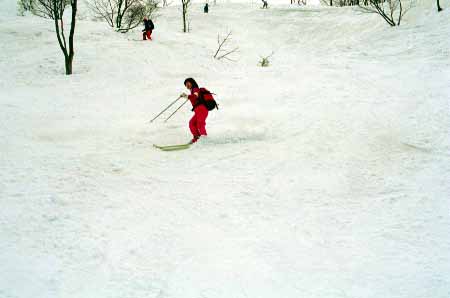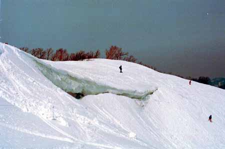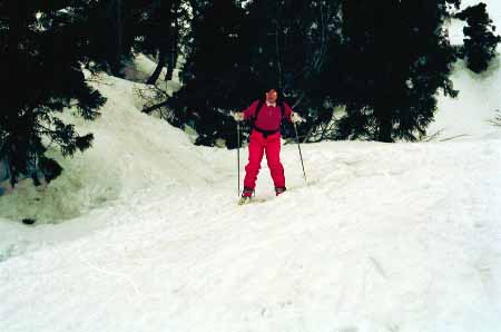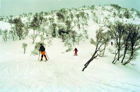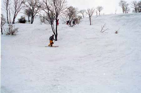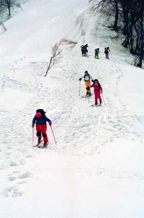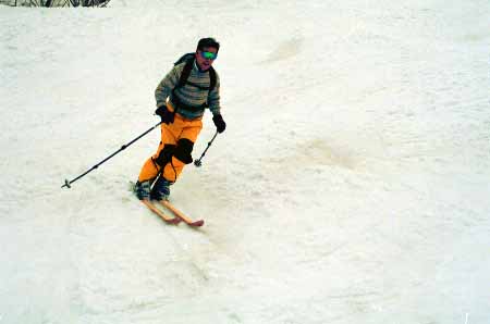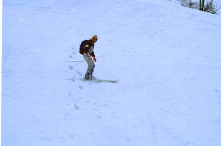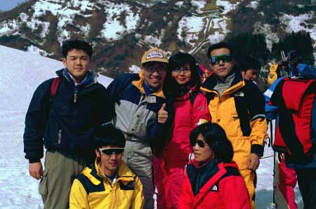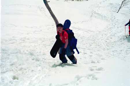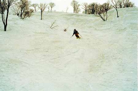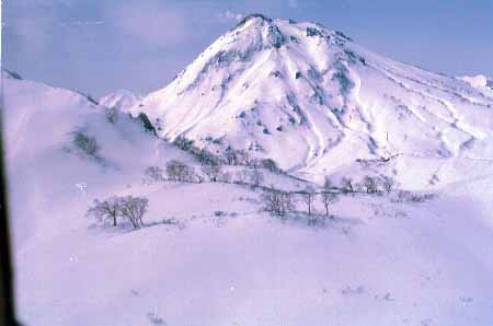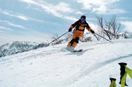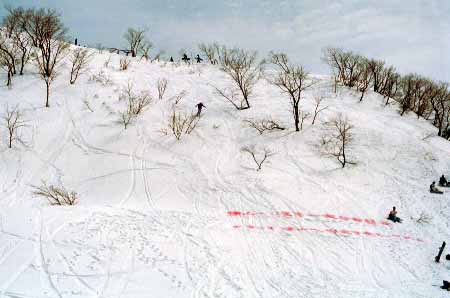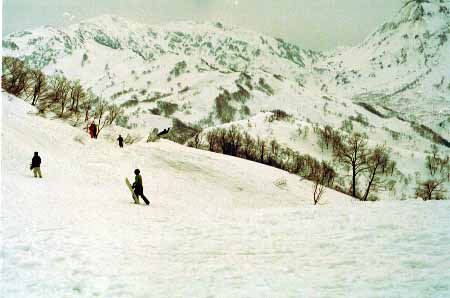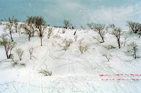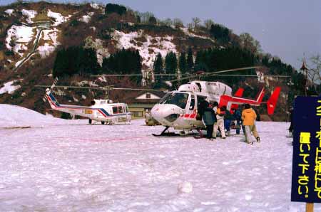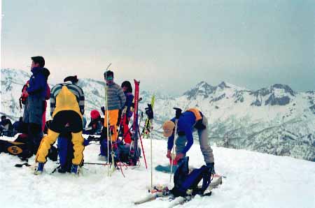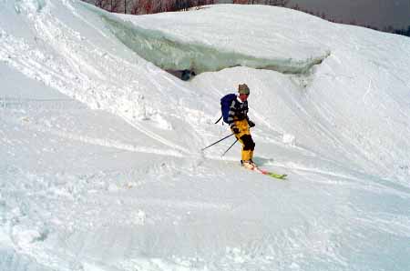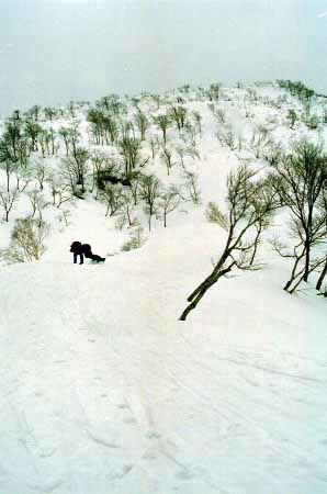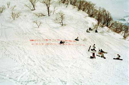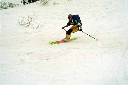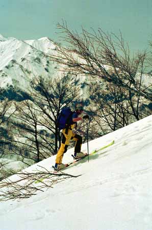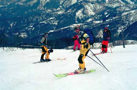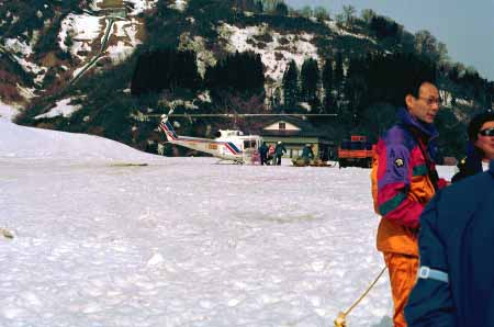 1998.4.4(日)焼山温泉スキー場からヘリであっという間に火打山北側約1800mの稜線へ・・・・暑い暑い。たまにはこんな極楽スキーも良いです。撮影 横山