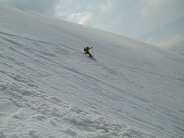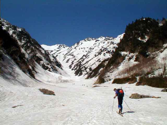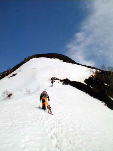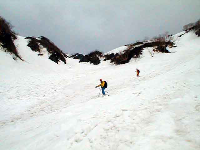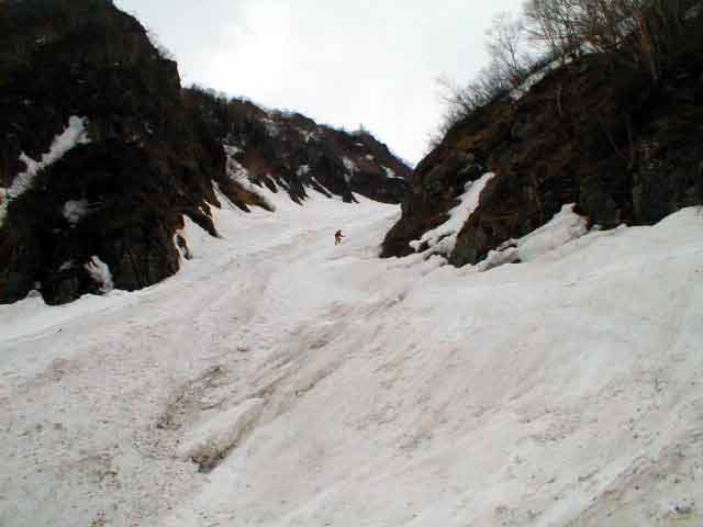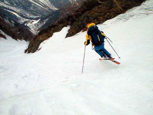 危ない。下の緩斜面にでたときはよれよれであった。雪の状態が良ければ