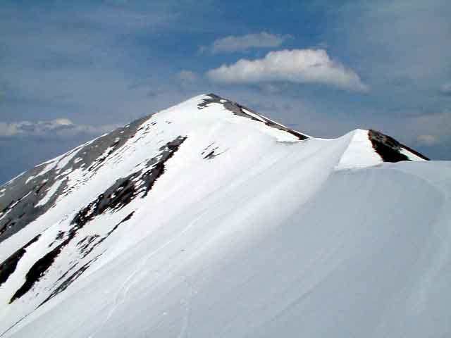 ヘルメットを着け滑降の支度をする。頂上直下は雪がしまっており快適。大沢