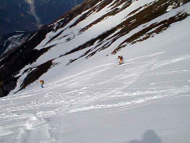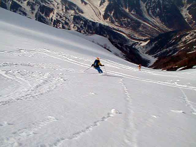 疲れるジャンプターンの急斜面はまだまだ続く。稜線から延々1000mの