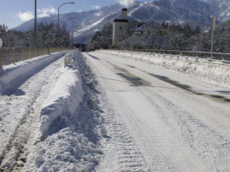 松川白馬大橋 村中圧雪路です。夜はカッキンコッキンです。