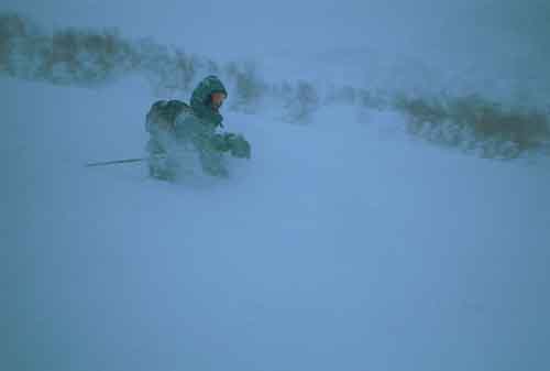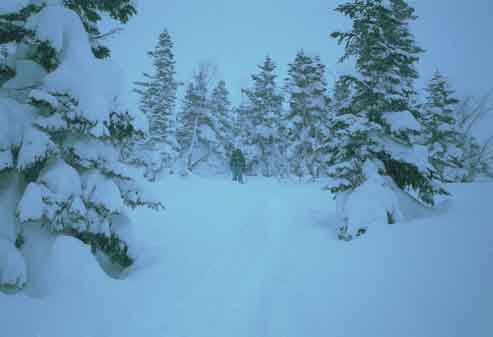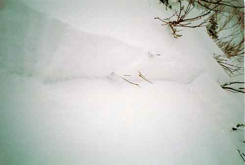 昨日から60センチ以上は積もっていたようだ。ラーメン食って行けるとこまで行こうと出発。ちょうどトレースがあったのでちゃっかり利用させていただく。天狗っぱらまで夏道を登り中間地点のいつもの休憩ダケカンバちょい上まで登る。先行パーティーに追いつくがかなりラッセルに苦戦している様だった。別ルートを取りラッセルするが時間切れで下る事にする。弱層テストをしたがフカフカの新雪が1メートル程積もっていた。いやらしい弱層は確認できなかったが量が凄いので登って右手の美味しい斜面はパスして往路を引き返す。あんまり新雪が多いので腰まで雪の中、スピードを落とすと止まるほどだ。でほとんど直滑降みたいな感じで顔面シャワー(良い表現が思いつかないので)を浴びながらの滑走となった。成城小屋の南の林道法面をショートカットして降りようとしたら吹き溜まりが崩壊して雪崩れてしまった。南向きの締まった雪面に新雪が乗っていてなじみが悪かった様だ。面白がって壊れた雪洞の上にのっかって試してみたが結果はやはり同じできれいに新雪が滑って落ちた。良く言う弱層が原因での雪崩のパターンとは違うのか、ごく薄い弱層が形成されていたのを見落としてしまったのかは不明だ。だがその下の旧雪は何回もジャンプしてやっと崩れるほど頑丈であった。