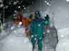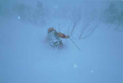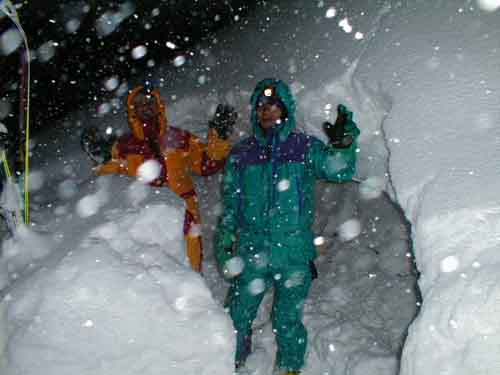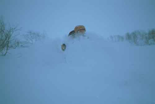 世はクリスマスっていうのにあいかわらず暇なぶなの森同人白馬支部?の菊地、本田、横山は白馬乗鞍のパウダー滑りに行こうと意気込んでいたのだが、雪は降ってるは、飲み過ぎたはで根性無しの3人は昼頃出発。栂池のゴンドラを下りると雪はかなり根性を入れて降っていた。ゲレ食でちょっと腹ごしらえしてリフトを1本乗り林道へ。大汗をかいて成城小屋ちょっとしたに到着。吹き溜まりの雪をゾンデで計ったら2.5メートルほど。雪洞に泊まったことのない菊地もいることだしってことで雪洞堀り開始。1時間30分ほどで4畳間ほどの雪洞が完成した。あとは速攻宴会に突入。まあスキーはつまみなので当然だ。ビールとバーボンとキムチ鍋で夢の世界へ。12時30分頃爆睡してると本田っちが「入り口の天井が下がってきてる」と起こされた。こりゃやばいって事で酔っぱらいでへろへろながらやっとの事でテントを設営、と同時にドンと低い音。見事に雪洞はぶっこわてれてしまった。細かい物を撤収した後でよかった。雪の下になったらたぶん春まで出てこなかっただろう。